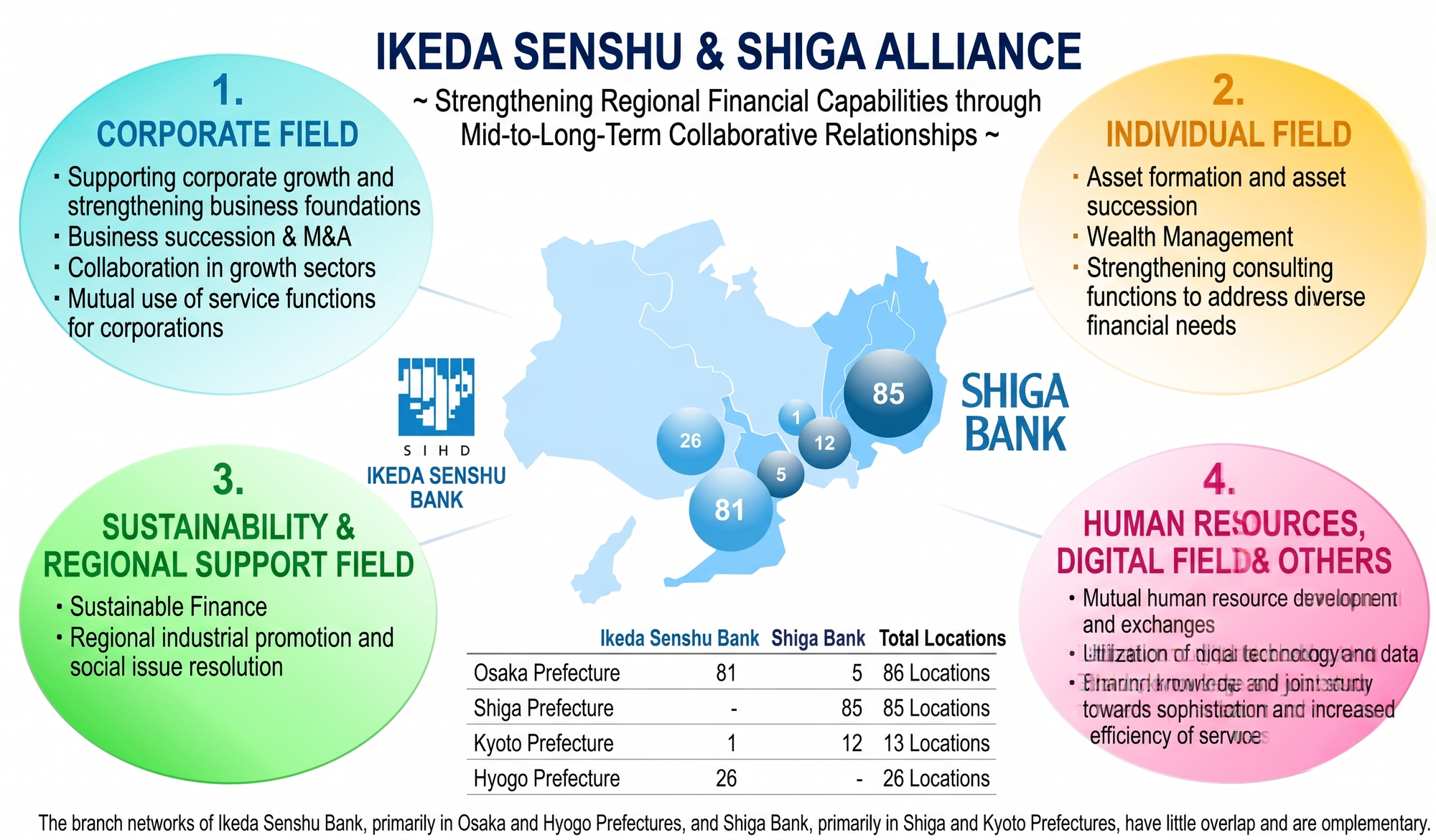 The two banks feature highly complementary geographic networks with minimal overlap. Shiga Bank’s core operations are based in Shiga and Kyoto prefectures, while Senshu Ikeda HD operates primarily in Osaka and Hyogo prefectures. The institutions have a history of cooperation, having made their mutual ATM networks fee-free for customers since 2017.