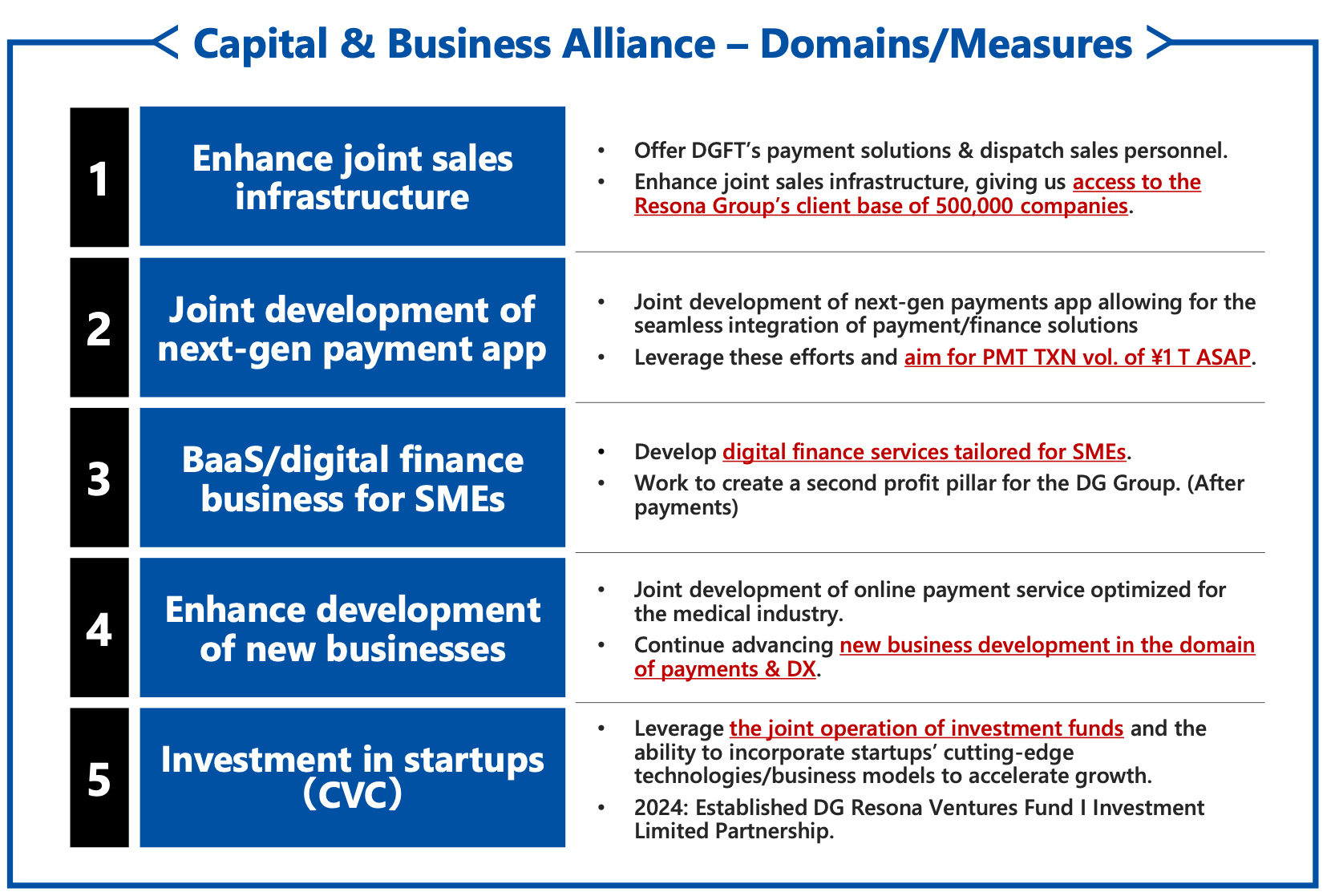 Digital Garage commenced a capital and business alliance with Resona in November 2022 and began collaboration in online payment and next-generation FinTech businesses. Furthermore, in December 2023, Digital Garage entered into another capital and business alliance agreement with Resona aimed at strengthening the existing capital and business alliance, agreeing to expand the alliance into joint startup investment and open innovation fields in addition to strengthening collaboration in online payment business and next-generation FinTech business. Digital Garage launched joint management of DG Resona Ventures Fund I Investment Limited Partnership for venture investment purposes and made Resona Kessai Service, a payment business subsidiary of Resona, an equity-method affiliate through partial share acquisition, steadily expanding collaboration between both group companies.