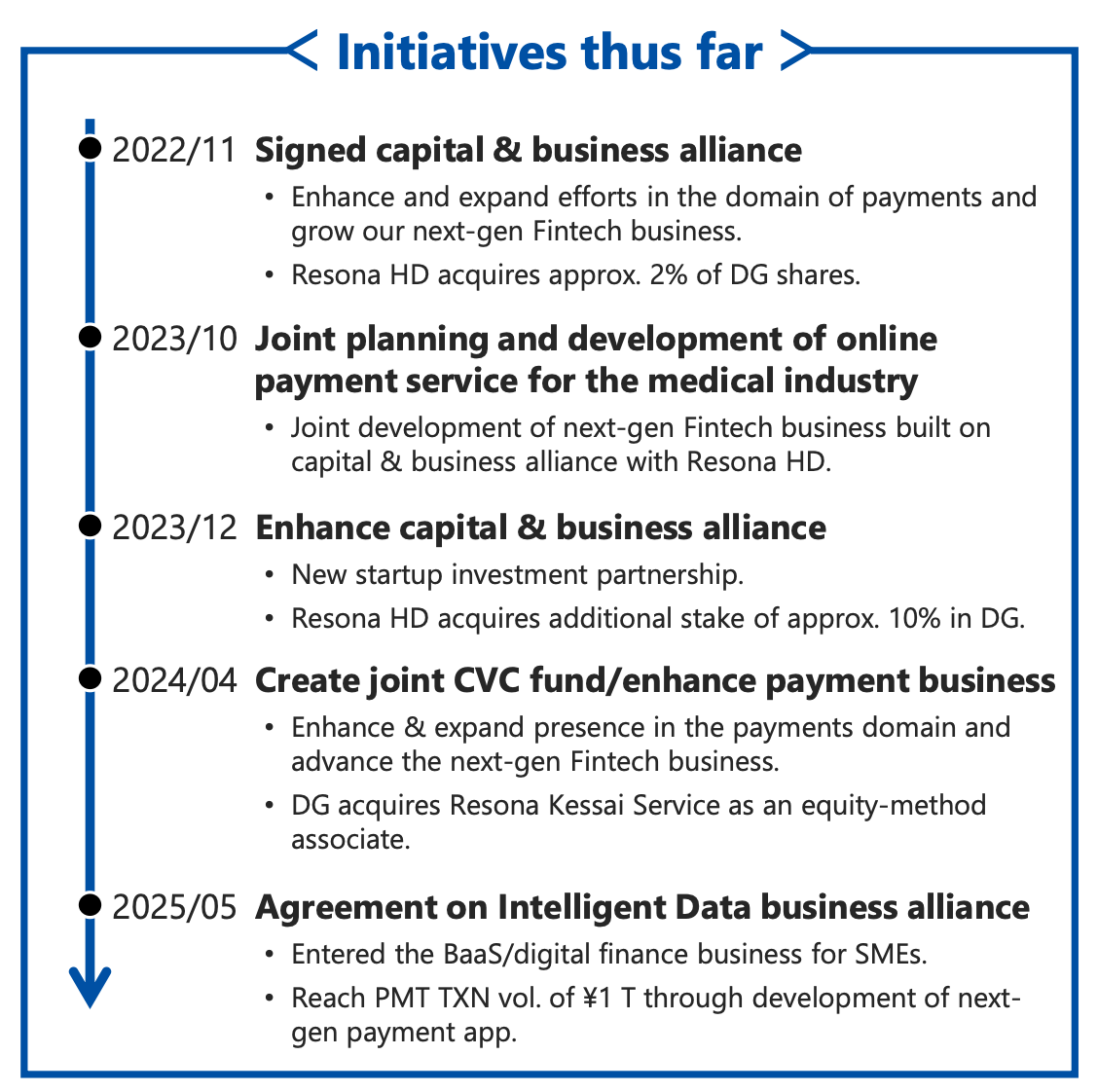 Digital Garage has agreed to enter into the Capital and Business Alliance Agreement to further strengthen the capital and business alliance with Resona HD. This will further expand and strengthen the existing business alliance framework, achieve greater integration of management resources of both group companies, and aim to strengthen payment business and expand market share, as well as accelerate growth of next-generation FinTech businesses including financial and DX services, which both companies prioritize in their medium-term management plans.