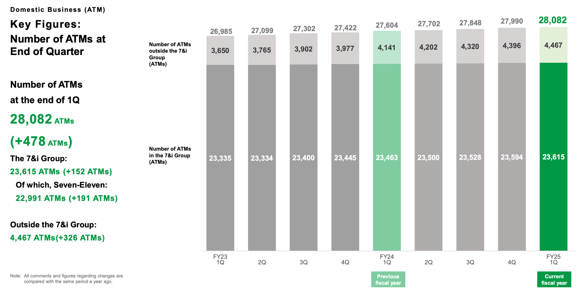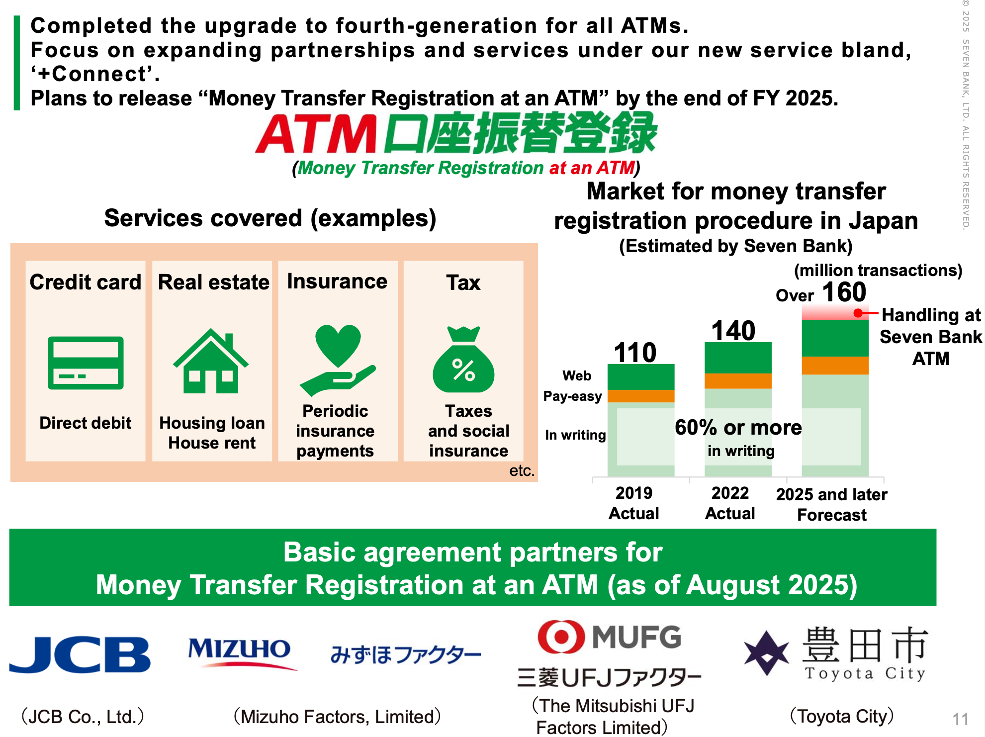 Seven Bank operates at more than 28,000 ATMs nationwide, including locations at 7-Eleven stores, shopping centers, tourist destinations, airports, and stations. Nationwide deployment of the new type of ATMs has been completed. They are equipped with identification document recognition and facial recognition features in addition to the existing cash deposit and withdrawal functions. Seven Bank is expanding various services that cater to customers' lives to broaden the possibilities of ATMs as a service platform.