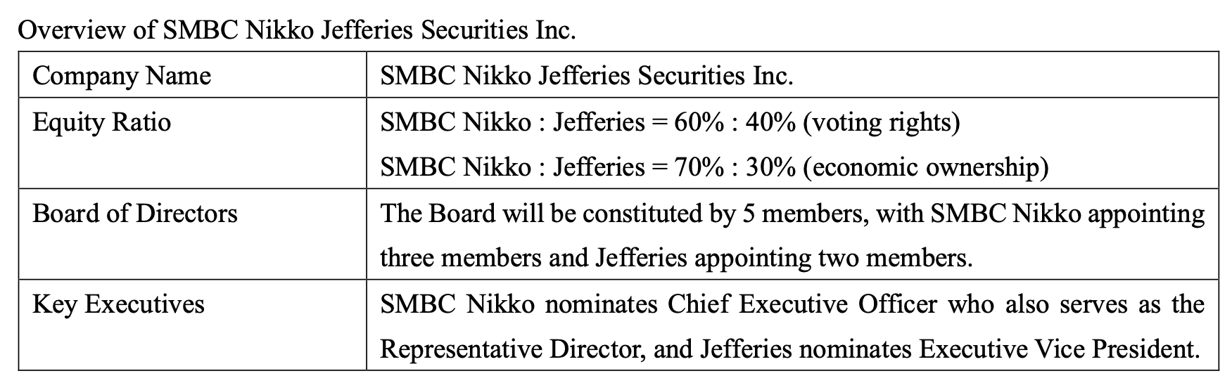 The respective wholesale Japanese equities businesses in Japan of SMBC Nikko and Jefferies will be consolidated into a newly established joint venture, which will serve as the core entity overseeing operations to ensure a unified global approach, while SMBC Nikko’s overseas wholesale Japanese equities business, including sales, will be transferred to and operated through Jefferies’ regional bases. The joint venture will be named SMBC Nikko Jefferies Securities and will be a consolidated subsidiary with a majority investment from SMBC Nikko. The integration will cover ECM operations, equity sales and trading, and equity research.