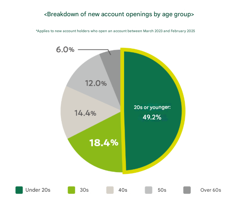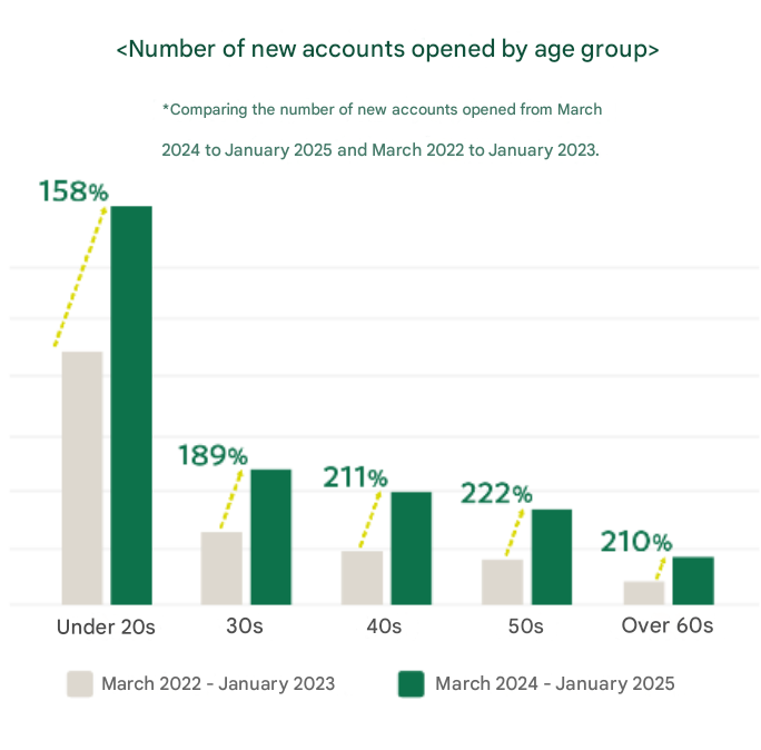 Since the launch of Olive services, about half of the customers who have opened new accounts are people in their 20s or younger. In addition, when looking at the number of new accounts opened by age group and comparing the number opened during the same period before and after Olive's launch, there has been a notable increase of 211% in those in their 40s and 222% in those in their 50s.
