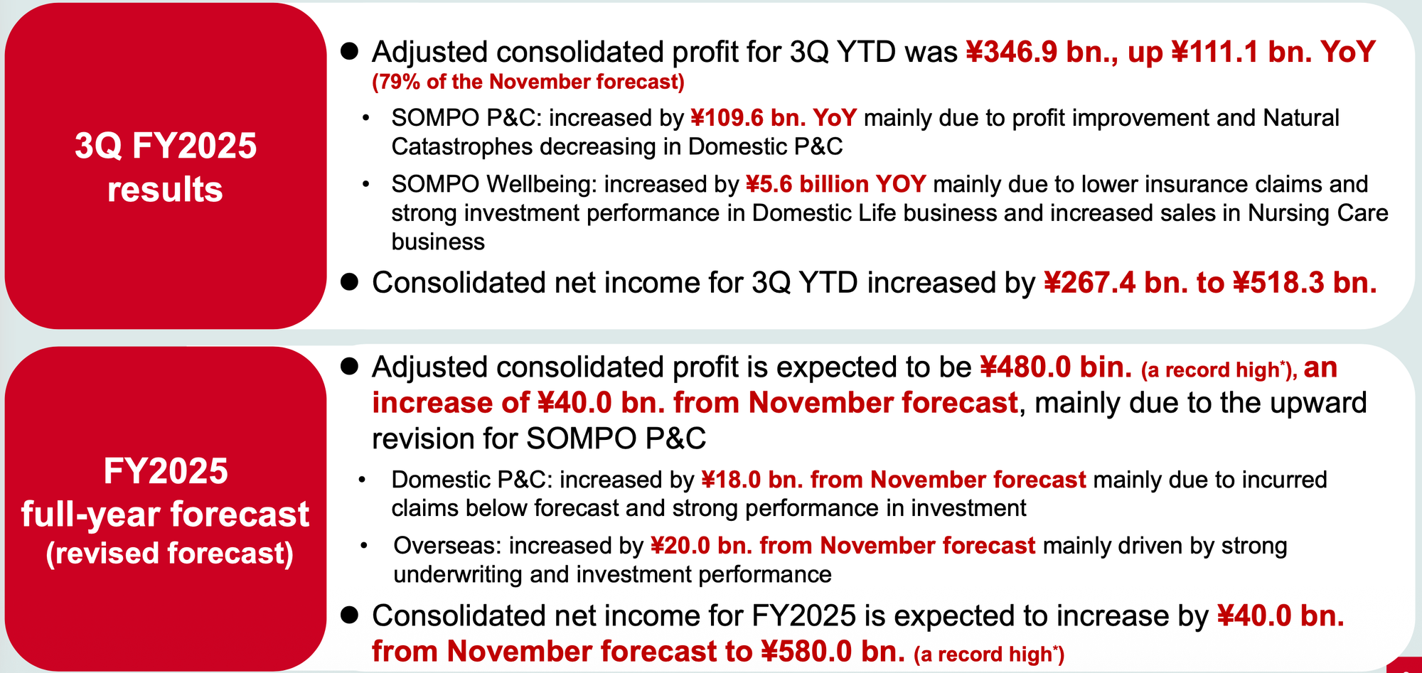 Buoyed by lower-than-expected natural catastrophe losses and strong investment returns, the insurer has revised its full-year adjusted consolidated profit guidance upward by ¥40.0 billion to a record-breaking ¥480.0 billion.
