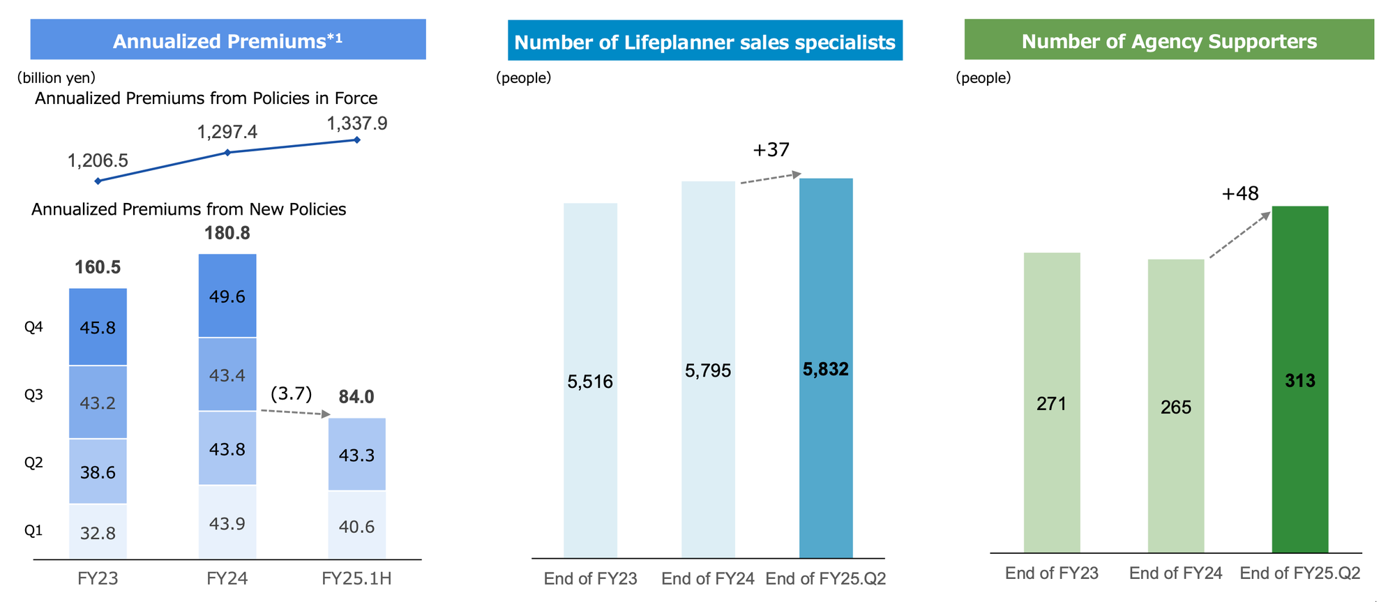 - Growing Sales Force: The recruitment of Lifeplanner sales specialists and Agency Supporters is progressing well, leading to a significant expansion of Sony Life's sales channels. As of the end of Q2, the sales force grew to 5,832 Lifeplanners and 313 Agency Supporters.