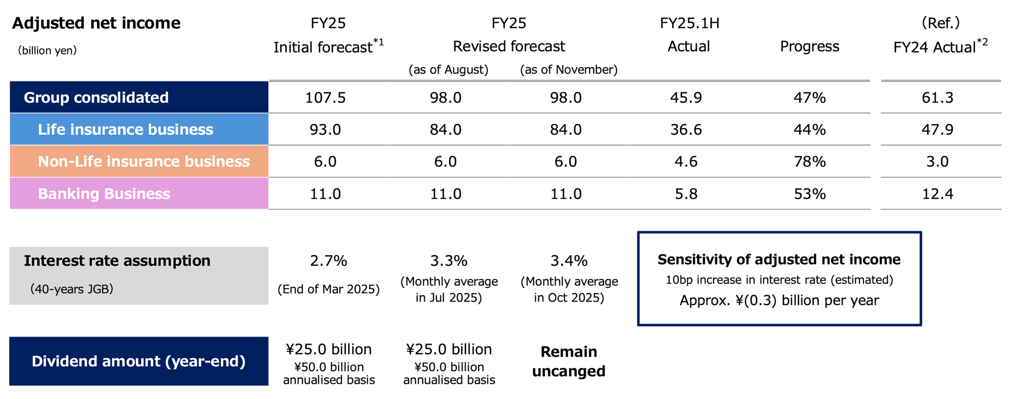 - Group Consolidated Adjusted Net Income: The forecast remains unchanged at ¥98.0 billion.