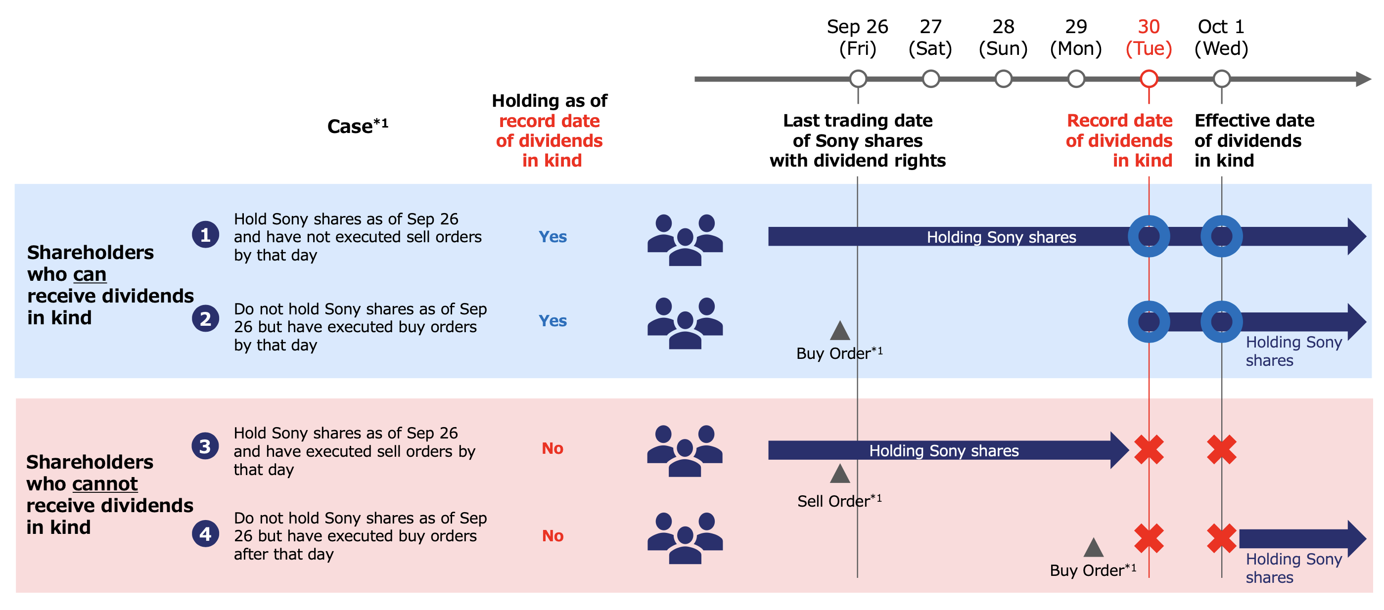 Sony details the process by which shareholders will receive SFGI shares. It provides scenarios illustrating the impact of buying or selling Sony shares around the ex-dividend date (September 30, 2025) and the last trading date with dividend rights (September 26, 2025). The key takeaway is that to receive the SFGI shares as a dividend-in-kind, investors must hold Sony shares as of the record date (September 30, 2025). The process involves meticulous tracking of buy and sell orders to determine eligibility.