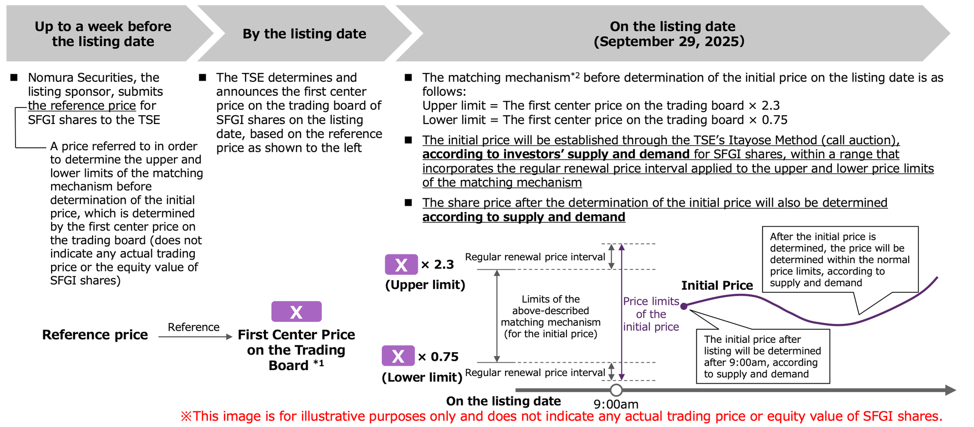 The actual initial price will be determined through the TSE's Itayose Method (call auction), which considers investors' supply and demand for SFGI shares. The price will be within a range that incorporates regular renewal price intervals applied to the upper and lower price limits of the matching mechanism. This process ensures a fair and transparent price discovery mechanism for the newly listed shares.