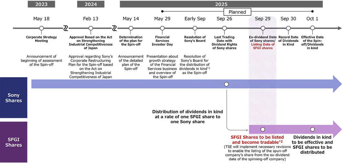 The spin-off will be executed through a dividend-in-kind distribution of SFGI shares to existing Sony shareholders, as shown in the title graphic. Shareholders will receive SFGI shares in proportion to their Sony shareholdings, effectively creating a new class of shareholders directly invested in the financial services business. Slightly more than 80% of SFGI's shares will be distributed, with Sony retaining the remaining shares. This dividend distribution is planned for October 1, 2025.