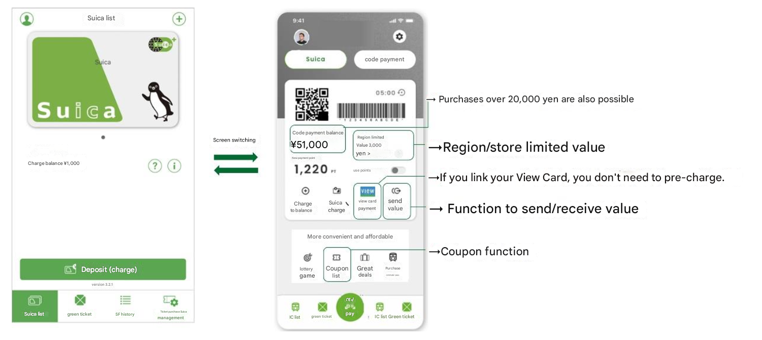 In addition to Suica's traditional easy & convenient touch payment, customers will then be able to enjoy QR code payments for purchases exceeding Suica's upper limit (20,000 yen). Furthermore, a send & receive value function will enable transfers between family and friends. By linking a VIEW Card, customers will be able to make QR code payments without pre-charging, up to their credit limit. Additionally, coupon functions for advantageous shopping and region/store-specific value issuance functions will be added, allowing merchants and regional partners to use these as promotional tools.