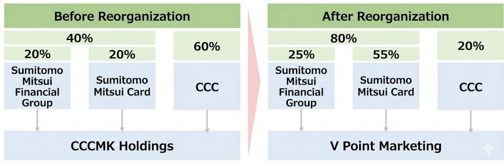 - Previously: The SMBC Group held a combined 40% stake (split equally at 20% each between SMFG and SMCC), while Culture Convenience Club (CCC) maintained a 60% controlling interest.