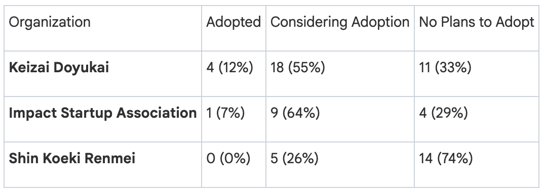 A joint survey of member companies from Keizai Doyukai, the Impact Startup Association, and Shin Koeki Renmei reveals a growing interest, with a significant number of organizations actively exploring implementation.