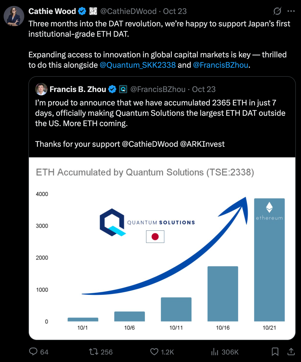This brings the group's total ETH holdings to 4,366.27 ETH (total acquisition cost approximately $17.78 million USD), establishing Quantum Solutions as the largest Ethereum Digital Asset Treasury (DAT) company outside of the US.