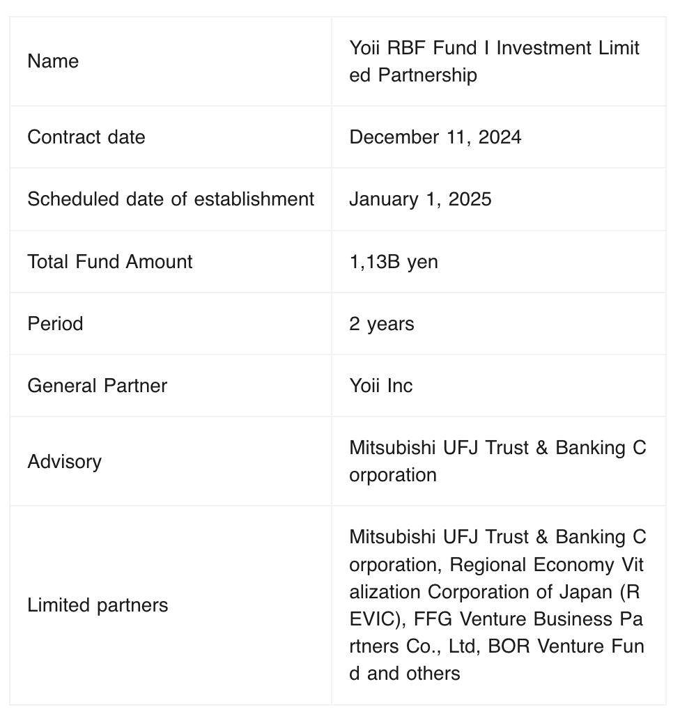 Yoii has recently completed the formation of Japan's first RBF fund with the full cooperation of Mitsubishi UFJ Trust & Banking, and the company sees this as a significant step forward in gaining an understanding of the RBF asset class among professional investors by having an institutional investor invest in RBF as an LP. Yoii believes that the future development of the Japanese economy will be driven by the development of new businesses.