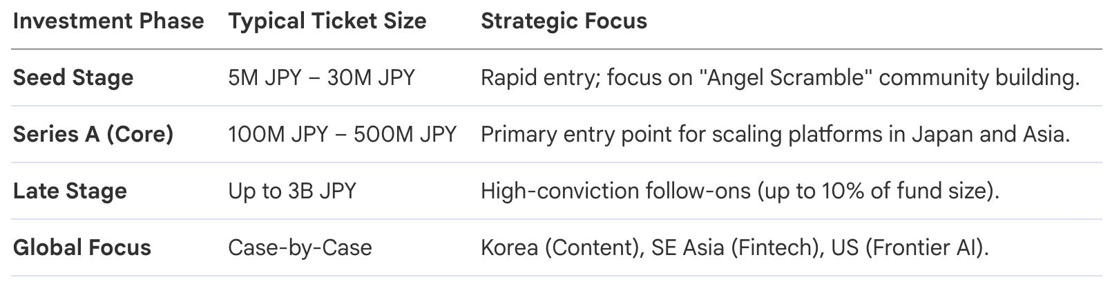 - Accelerated Seed Track: For investments up to 30 million JPY, ZVC utilizes a streamlined 2-week decision cycle. This enables ZVC to capture top-of-funnel opportunities before traditional competitors can issue a term sheet.